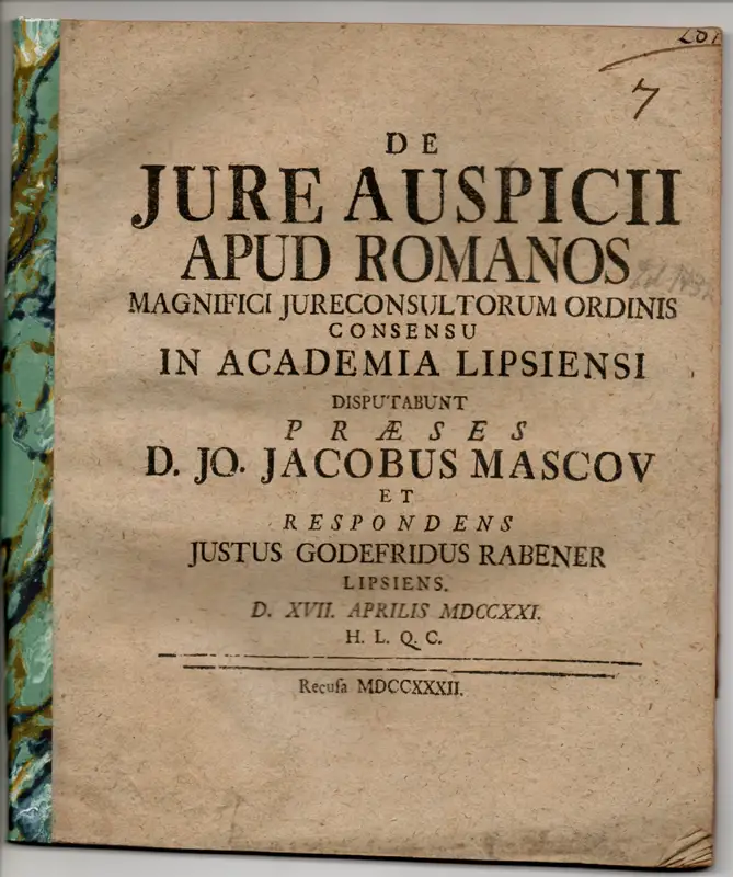 Rabener, Justus Gottfried: aus Leipzig: De iure auspicii apud Romanos.