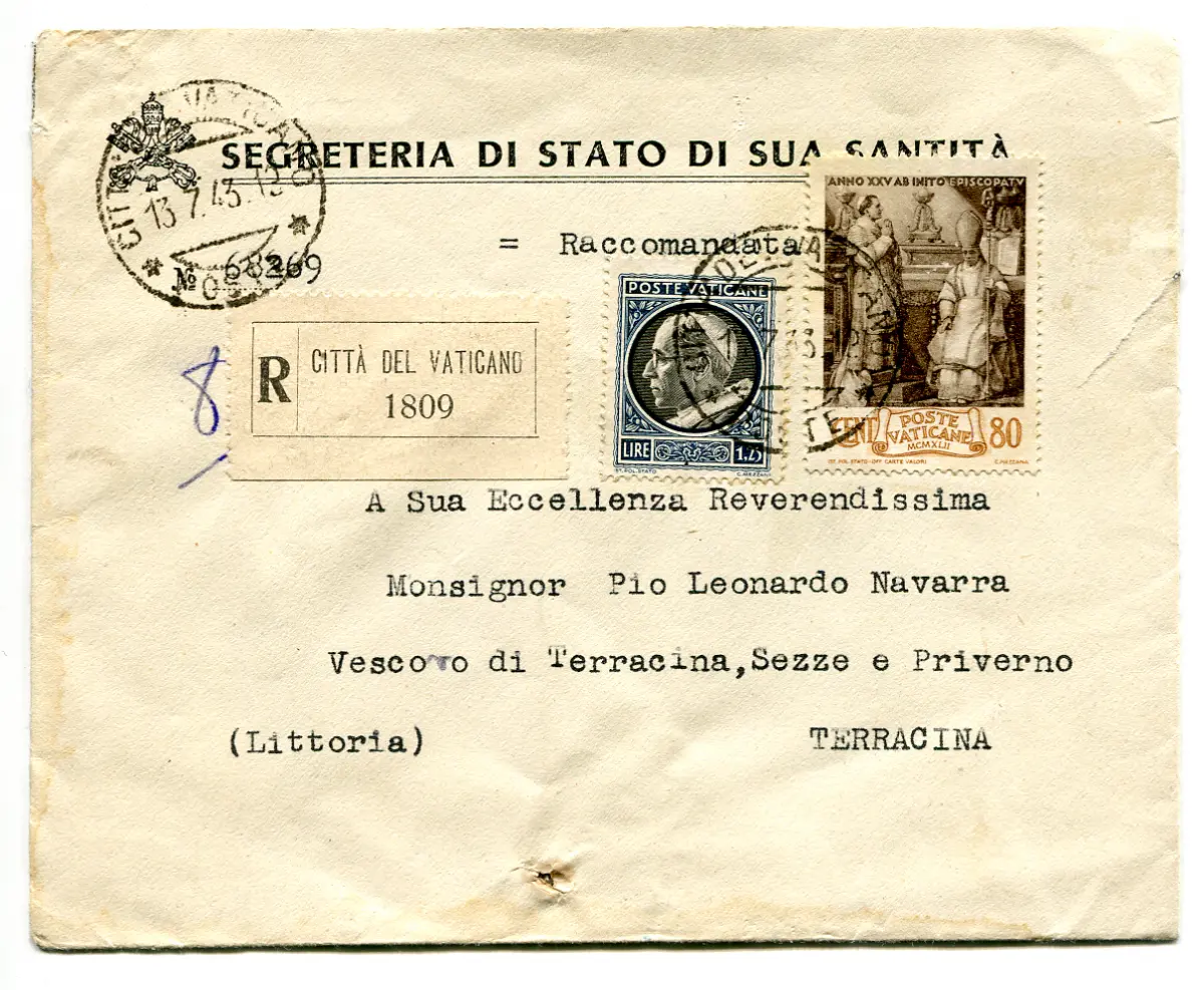 Racc. aus dem SS-Staatssekretariat. Pius XII. an den Bischof Umschlag - Umschlag Racc. nach Terracina am 13.7.43 vom Staatssekretariat der SS. Pius XII. Direkt an den Bischof von Terracina (Littoria) frankiert mit Nr. 74 + 81 - Im Tarif Cod.1193/WEB