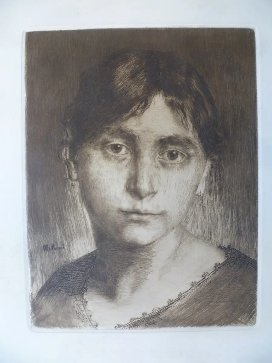 Mädchenbildnis. Originalradierung von Otto Rasch. In der Platte signiert, rückseitig mit Bleistift eigenhändig(?) bezeichnet Otto Rasch / Studie und Sammlerstempel Otto Pangritz. Bildgröße 22x16m, Blattgröße 50x35cm. Im Randbereich etwas fleckig. Gut erhalten.