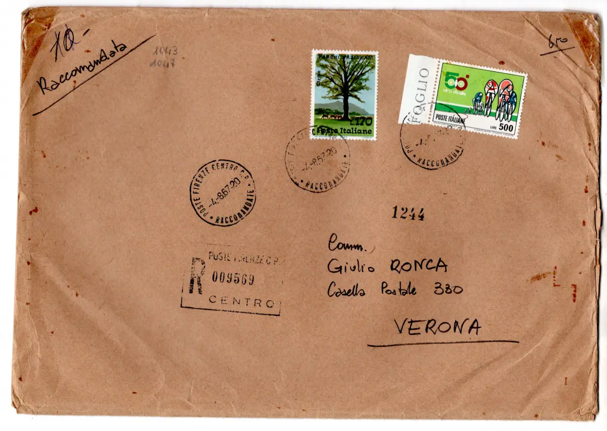 - Radsport Lire 500 Nr. 1047 + Ergänzung Nr. 1043 auf Umschlag Racc. (Großformat) von Florenz nach Verona am 4.8.67 - wertvolle Nutzung im ersten Zeitraum über 20 Lire (13 Häfen) (757/19)