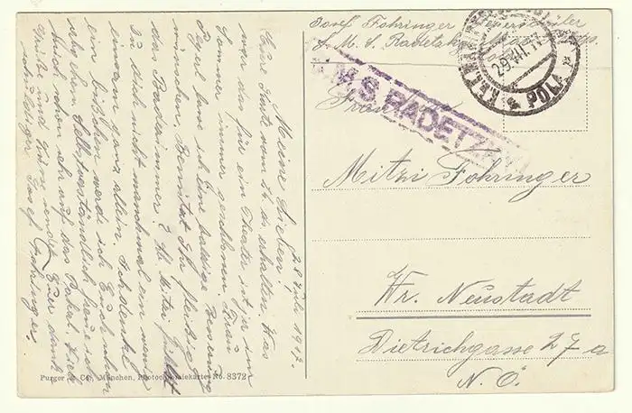 Bemerkungen: Gelaufen m. Stempel: S.M.S. Radetzky - einzeiliger violetter Kastenst.-KALIS6-P.30 neben Tst. K.u.K.Marinepostamt/19VII17/Pola.