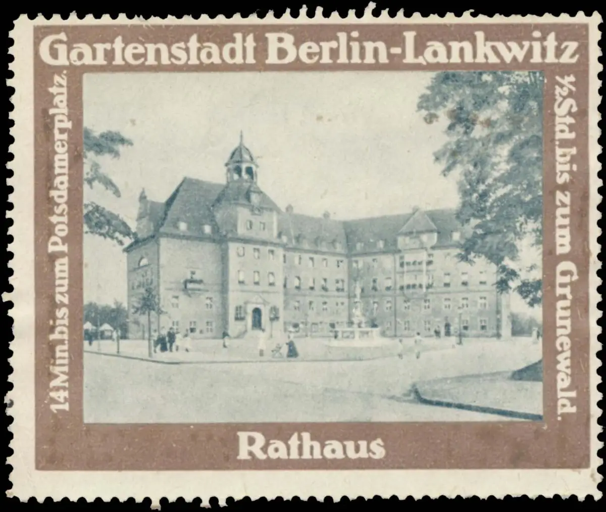 Gartenstadt Berlin-Lankwitz, 1/2 Stunde bis zum Grunewald, 14 Minuten bis zum Potsdamerplatz, braun, Größe/Zustand: 5x6 , leicht fleckig, Original alte Reklamemarke die seinerzeit für die Werbung benutzt wurde