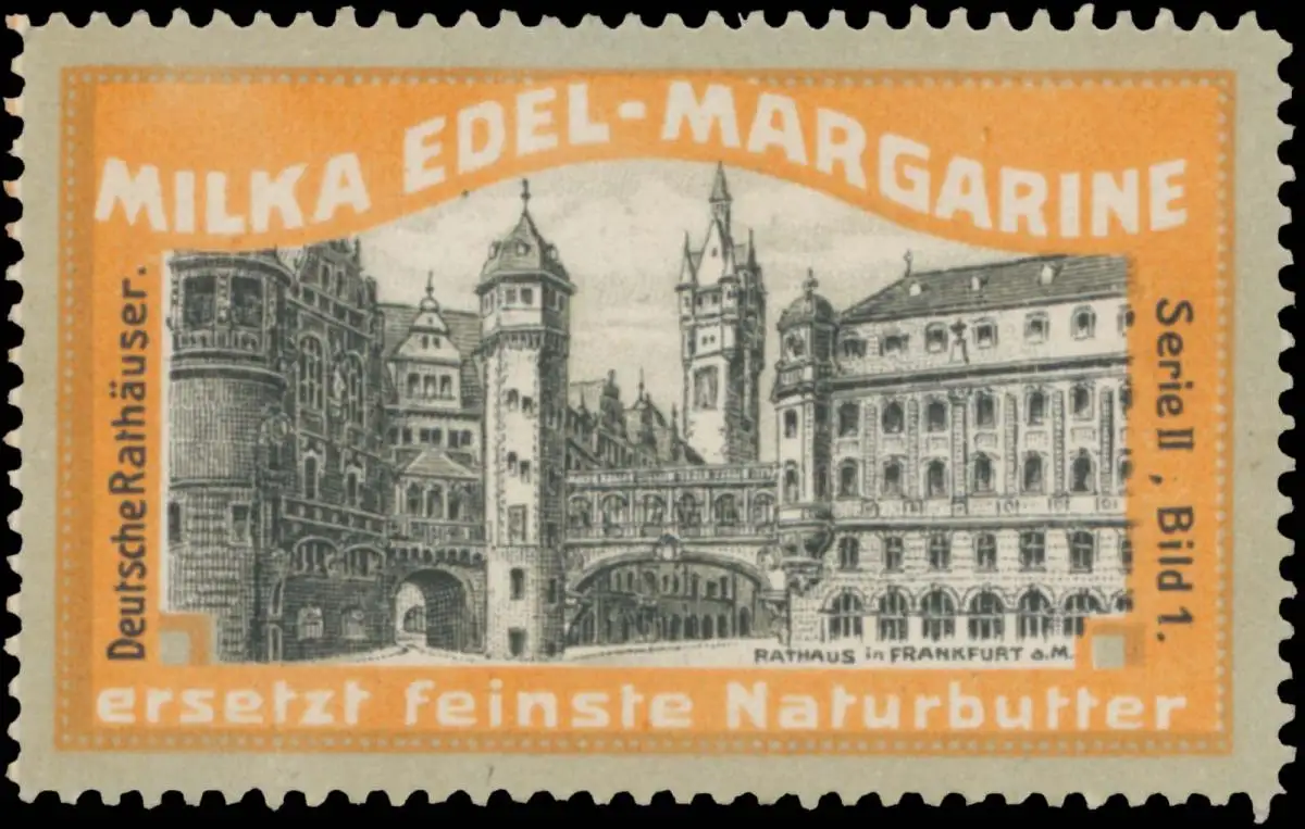 Serie II, Bild 1, Deutsche Rathäuser, Milka Edel-Margarine ersetzt feinste Naturbutter, Größe/Zustand: 3x6 , guter Zustand, Original alte Reklamemarke die seinerzeit für die Werbung benutzt wurde
