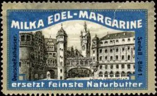 Deutsche Rathäuser Serie II, Bild 1, Milka Edel - Margarine ersetzt feinste Naturbutter, Größe/Zustand: 3x6 , guter Zustand, Original alte Reklamemarke die seinerzeit für die Werbung benutzt wurde