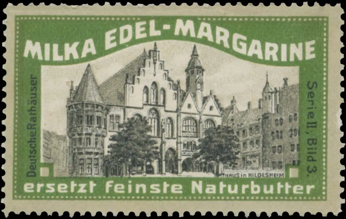 Deutsche Rathäuser, Serie 2, Bild 3, Milka Edel-Margarine ersetzt feinste Naturbutter, Größe/Zustand: 3x6 , guter Zustand, Original alte Reklamemarke die seinerzeit für die Werbung benutzt wurde