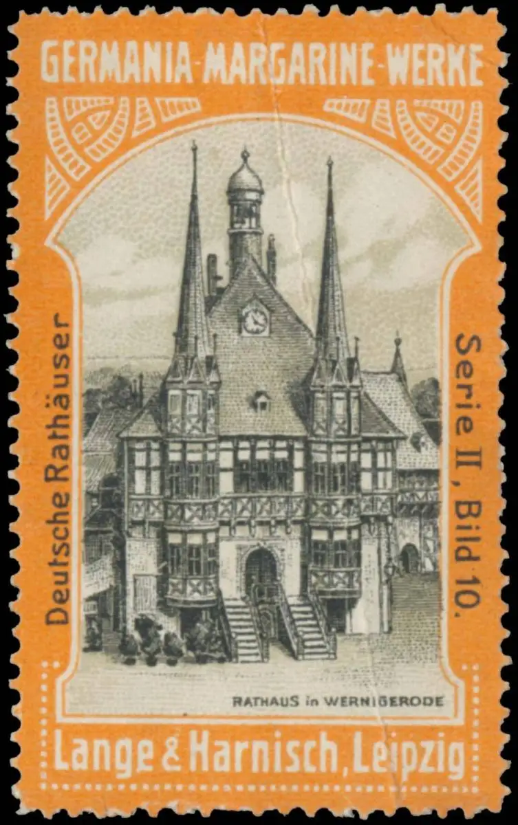 Serie II: Deutsche Rathäuser, Bild 10, orange, Größe/Zustand: 5x3 , leicht beschädigt, Original alte Reklamemarke die seinerzeit für die Werbung benutzt wurde