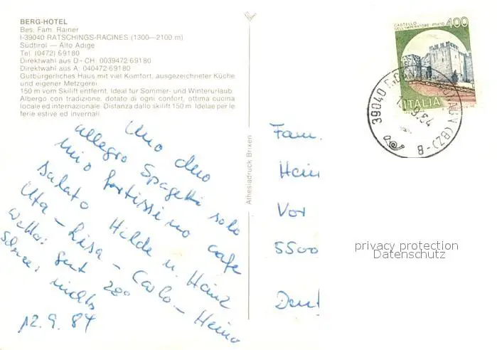 Ratschings Berg-Hotel Ratschings postalisch gelaufen nach 1965 Erhaltung siehe scans [PaolaD17] PaolPID1