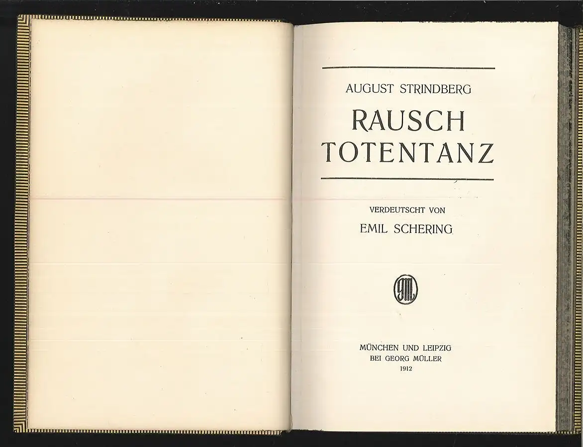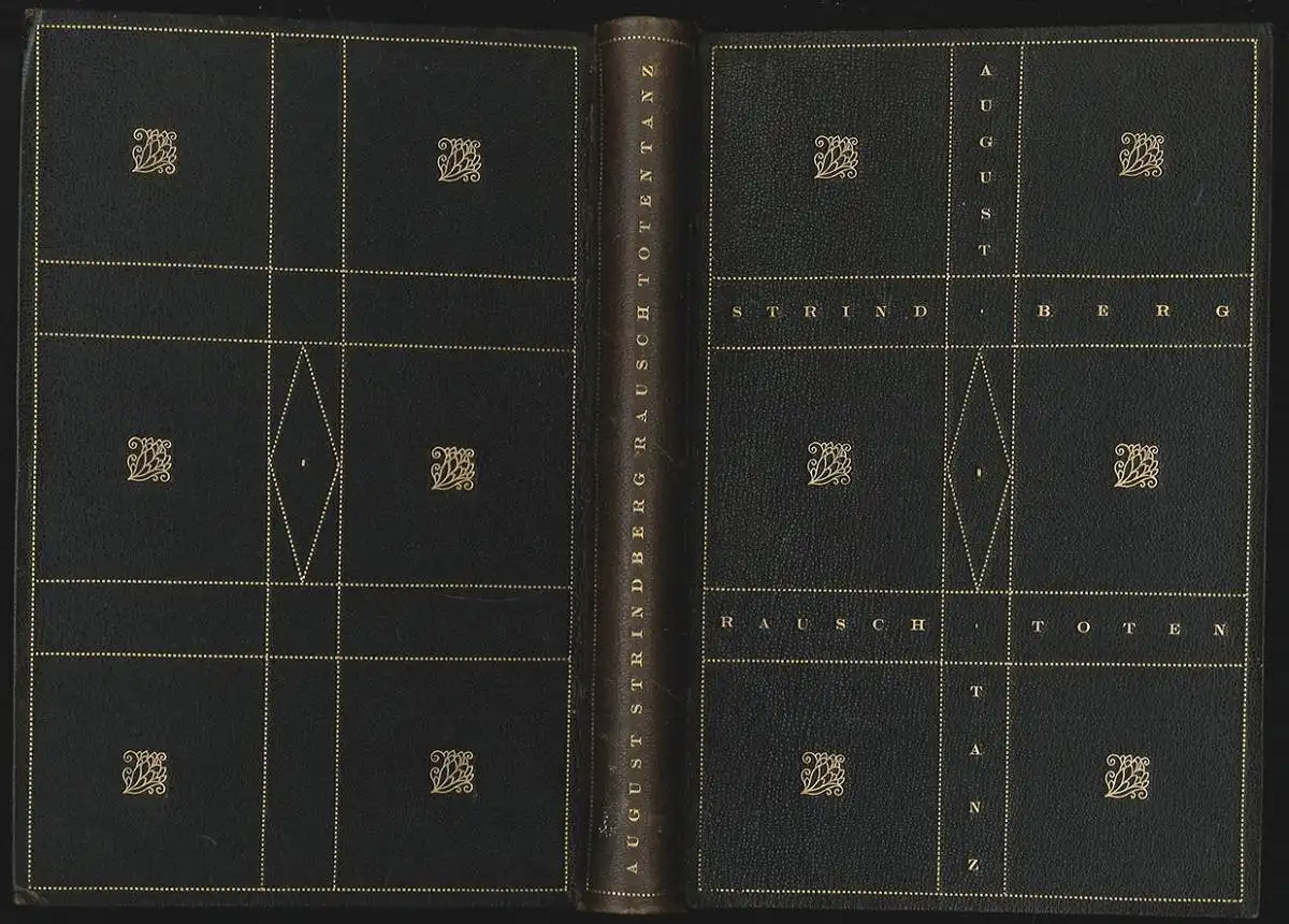 Bemerkungen: Deutsche Erstausgabe der beiden Werke von August Strindberg (1849-1912) in einem unsignierten, jedoch stark an den Stil der Wiener Werkstätte erinnernden schwarzen Handeinband. Die Deckel sind je in 6 Quadrate mit rechteckigen Zwischenfeldern unterteilt, in die auf dem Vorderdeckel die Autoren- und Titelangabe geprägt wurde. Das mittlere Rechteck enthält eine vertikale Raute. Mittig in den 6 Quadraten sind kleine quadratisch-florale Stempel gedruckt. Die Vorsätze wurden mit schwarz-weißem Kleisterpapier gestaltet.