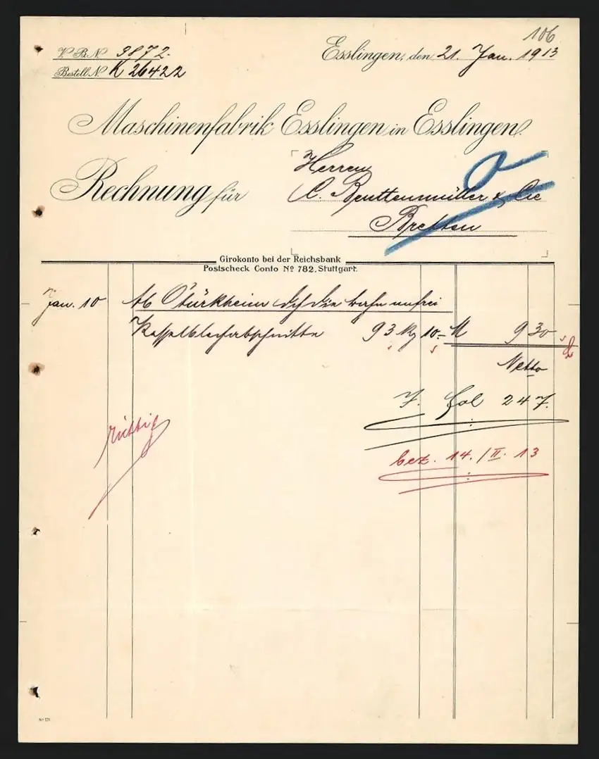 Rechnung Esslingen 1913, Maschinenfabrik Esslingen