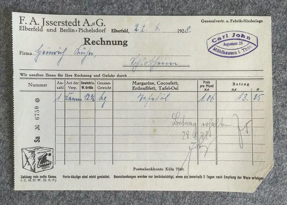 Originale Rechnung, 1928. Format ca. 20,5 x 14 cm. Erhaltung: leicht unsauber, wurde gefaltet, alles weitere siehe bitte Fotos. Diese Ware unterliegt der Differenzbesteuerung nach § 25a UStG. Es wird keine Mehrwertsteuer in der Rechnung ausgewiesen. iLn.: D4