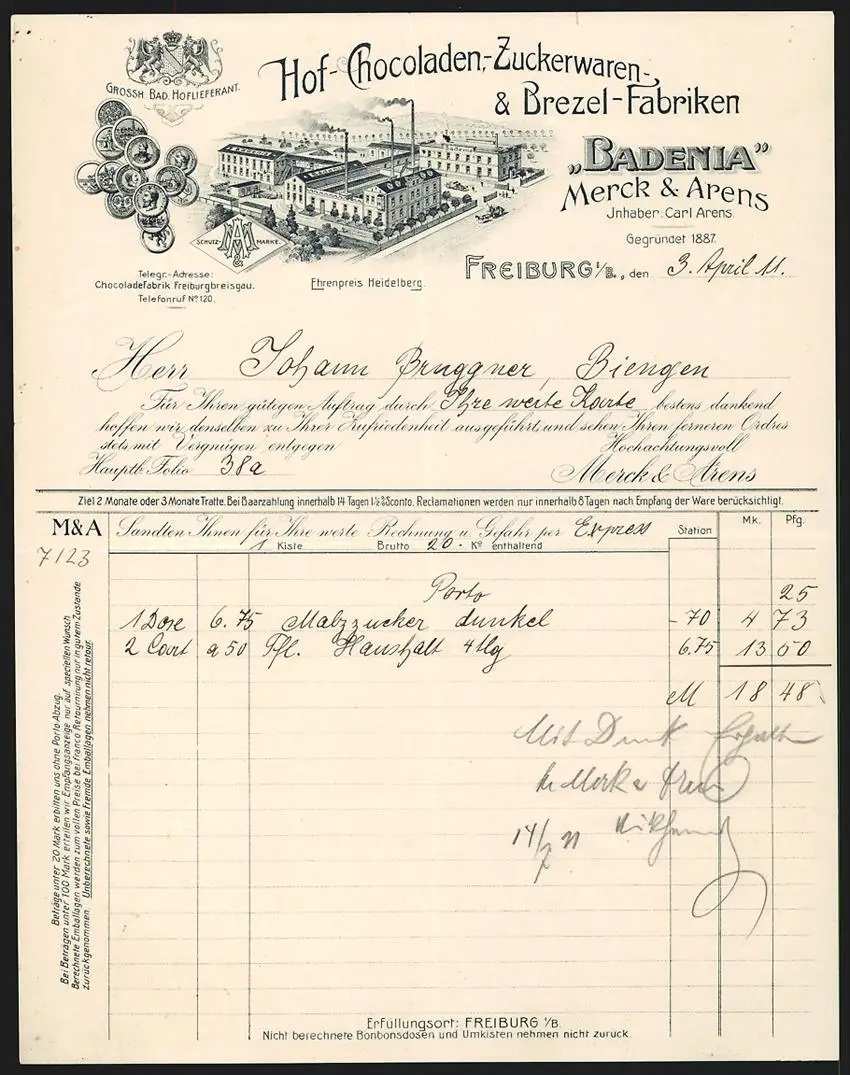 Rechnung Freiburg i. B. 1911, Badenia, Hof-Chocoladen-, Zuckerwaaren- und Brezel-Fabriken Merck & Arens, Werkansicht