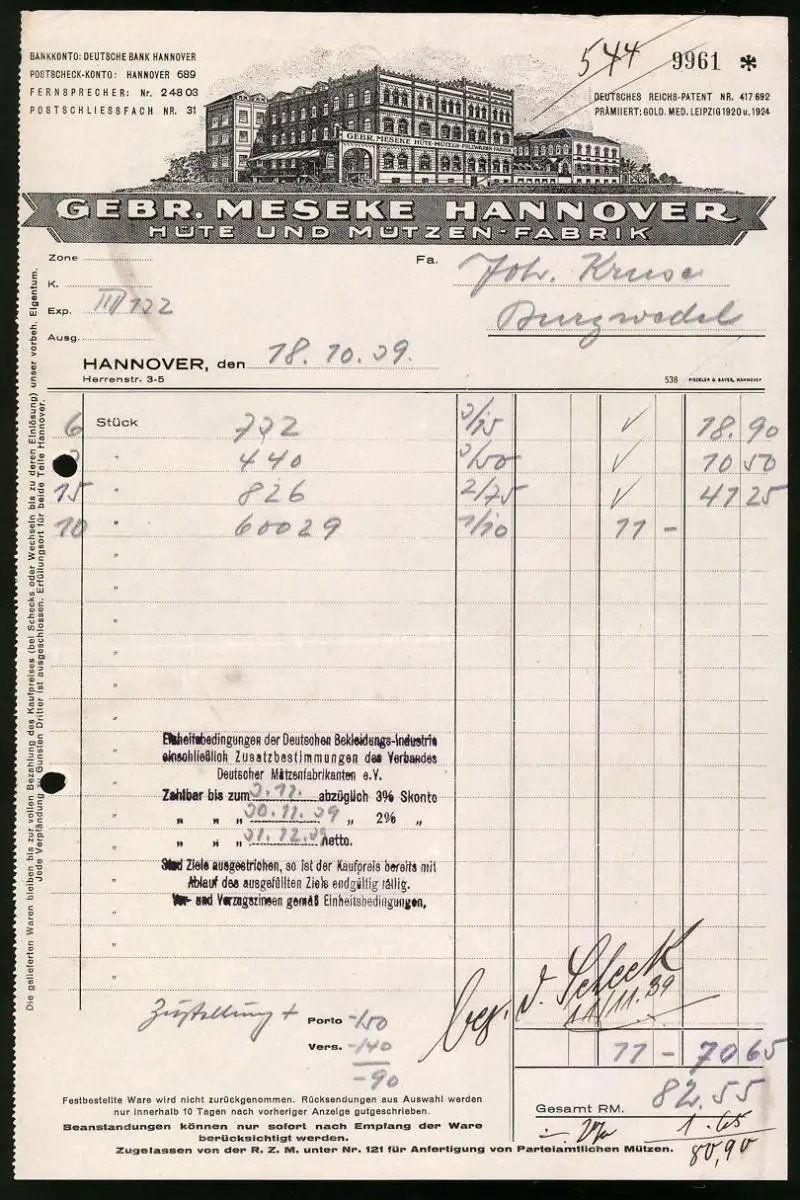Rechnung Hannover 1909, Hüte und Mützenfabrik Gebr. Meseke, Werksgebäude