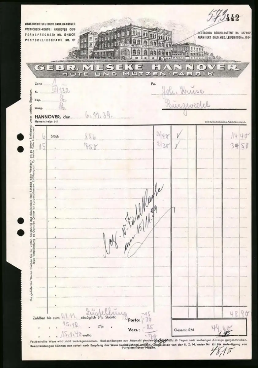 Rechnung Hannover 1939, Hüte und Mützenfabrik Gebr. Meseke, Blick auf das Werk