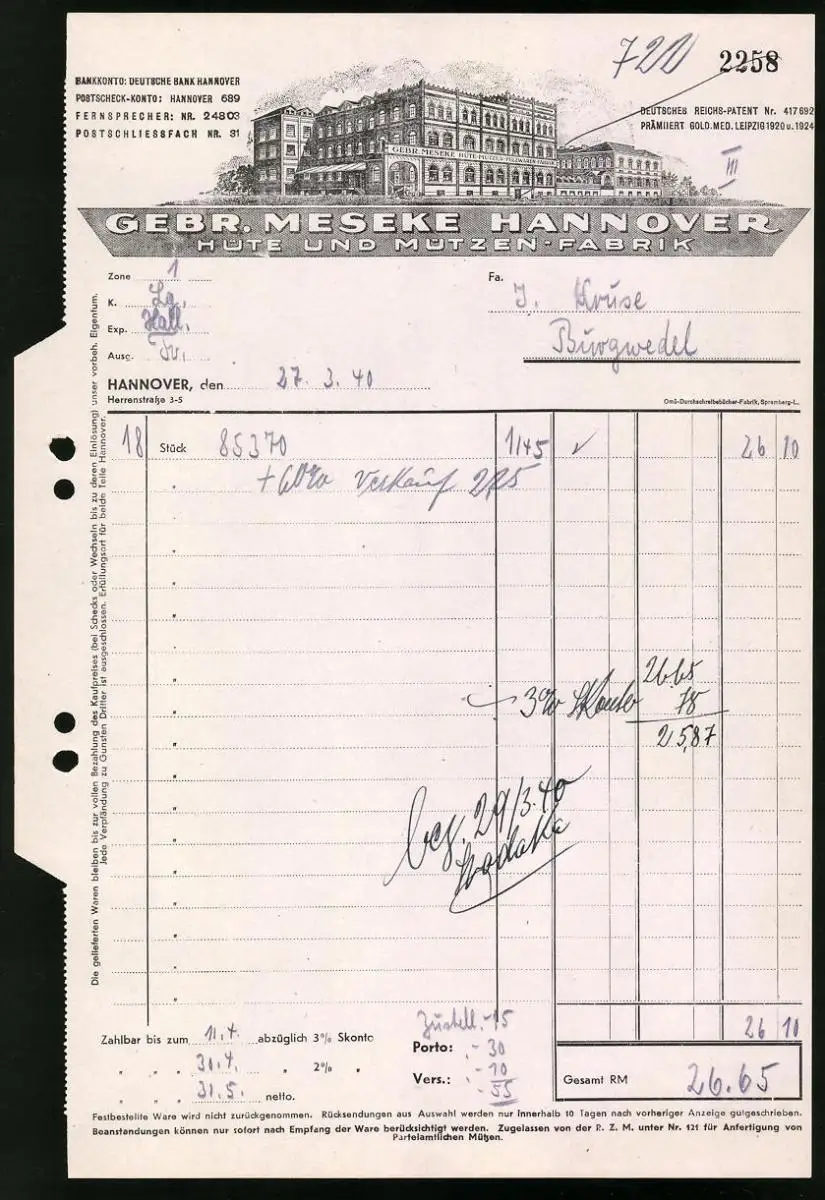 Rechnung Hannover 1940, Hut und Mützenfabrik Gebr. Meseke, Werksansicht