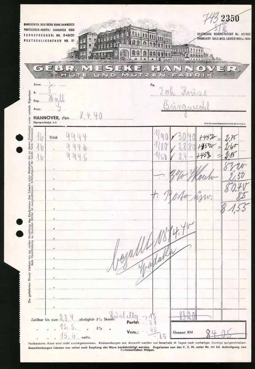Rechnung Hannover 1940, Mützen und Hut Fabrik Gebr. Meseke, Firmengebäude