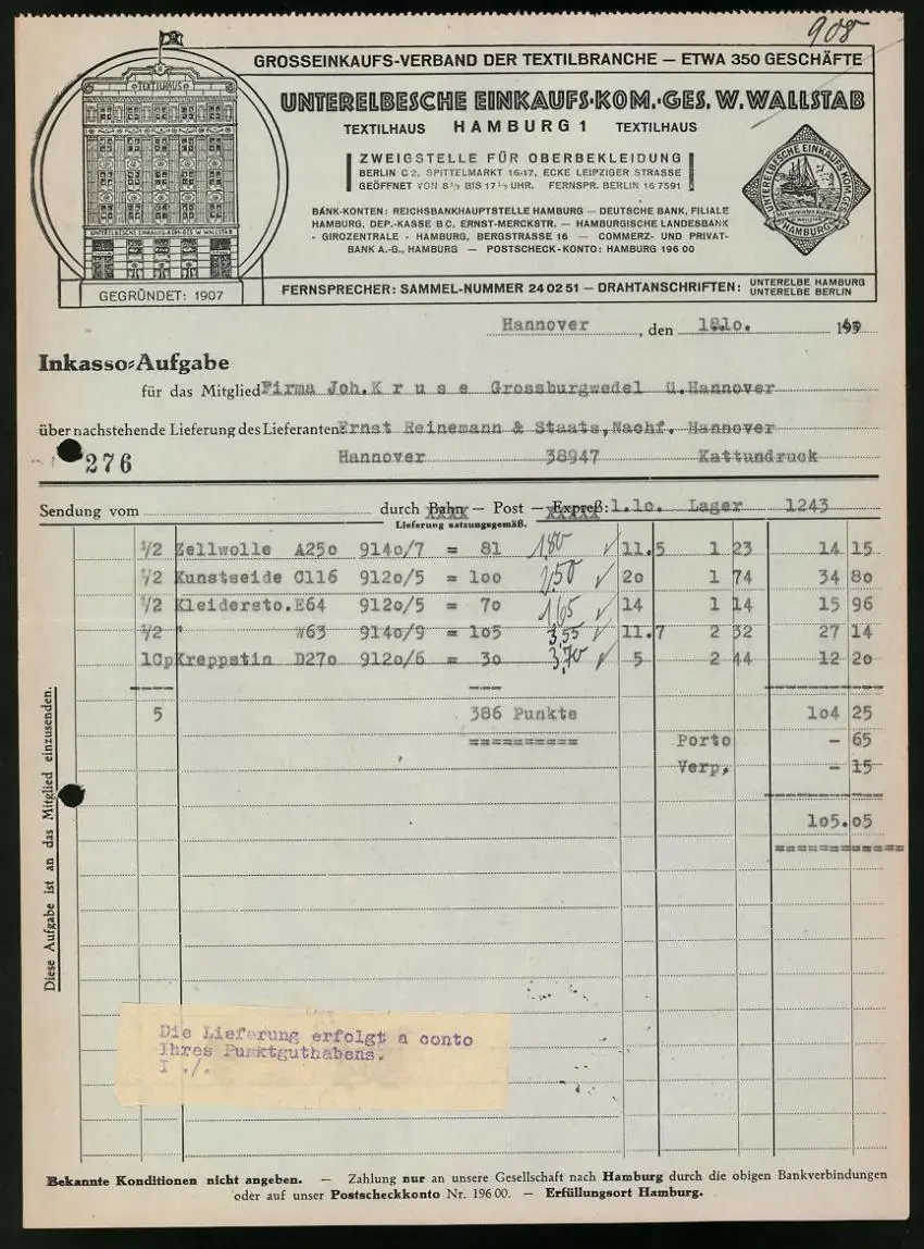 Rechnung Hannover 1940, Unterelbsche Einkaufs-Kom.-Ges. W. Wallstab, Ansicht der Verkaufshausfront
