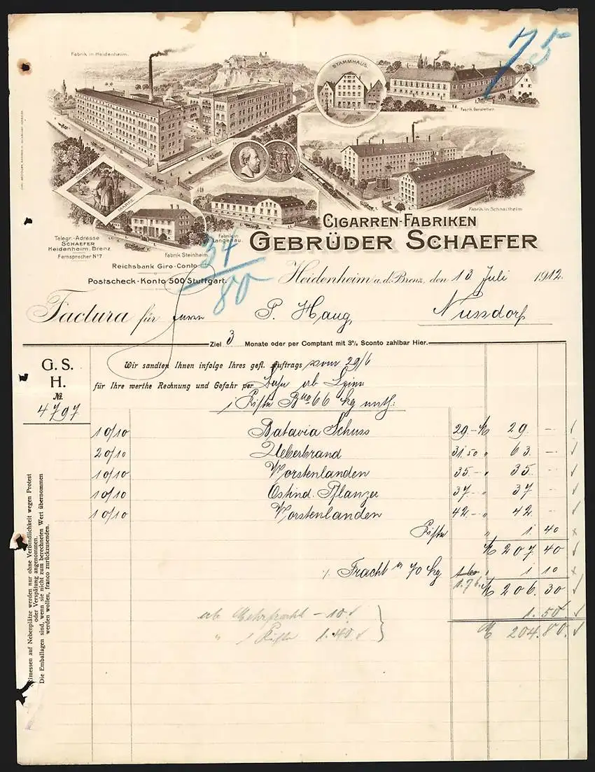 Rechnung Heidenheim a. d. Brenz 1912, Gebrüder Schaefer, Cigarren-Fabriken, Ansichten verschiedener Geschätsstellen