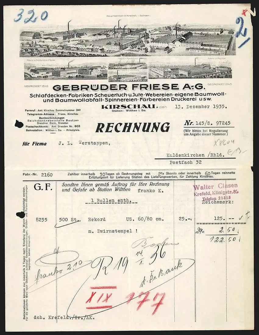 Rechnung Kirschau 1935, Gebrüder Friese AG, Textil-Fabrikation, Ansicht von fünf Betriebsstellen