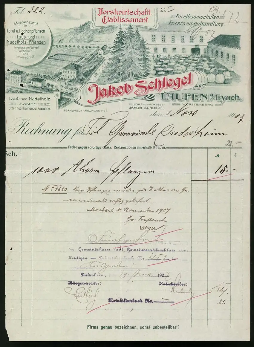 Rechnung Laufen a. Eyach 1907, Forstbaumschule - Forstsamenhandlung Jakob Schlegel, Blick auf die Forstschule