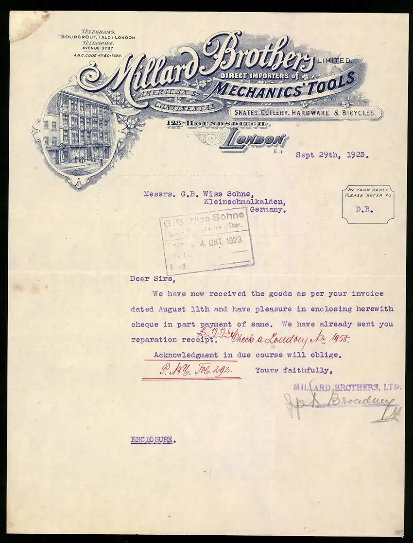 Rechnung London 1923, Millard Brothers, Skates, Cutlery, Hardware & Bycicles, the Storefront