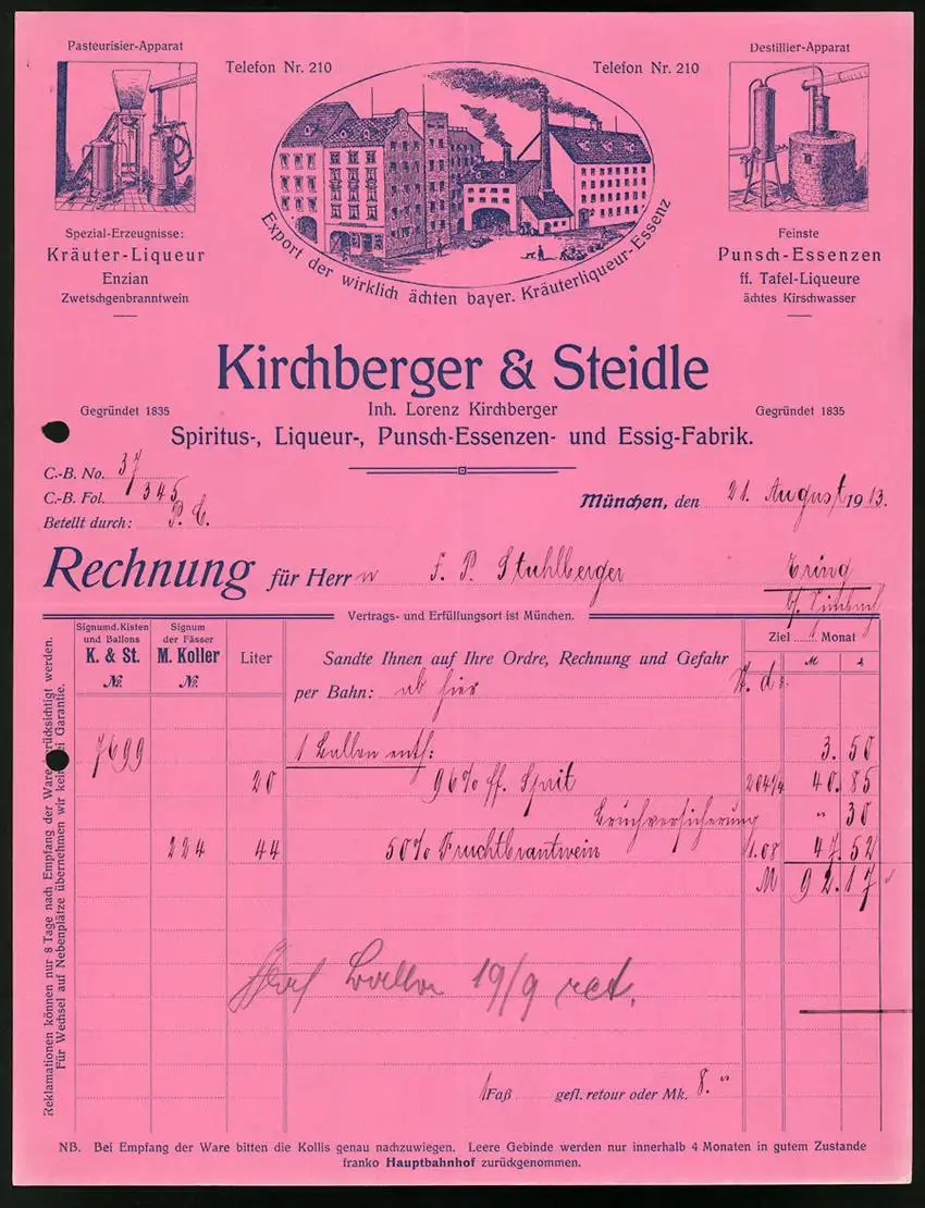Rechnung München 1913, Spiritus, Liqueur, Punsch-Essenzen und Essig-Farbik Kirchberger & Steidle, Werksansicht