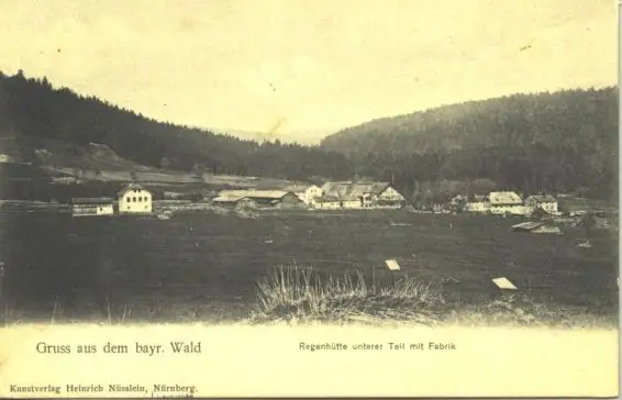 Regenhuette (intern : 1016713) : Ansichtskarte "Gruss aus dem bayr. Wald - Regenhuette unterer Teil mit Fabrik". PLZ-Bereich 94252. Unbeschrieben. Kunstverlag Nuesslein, Nuernberg (um 1900?)