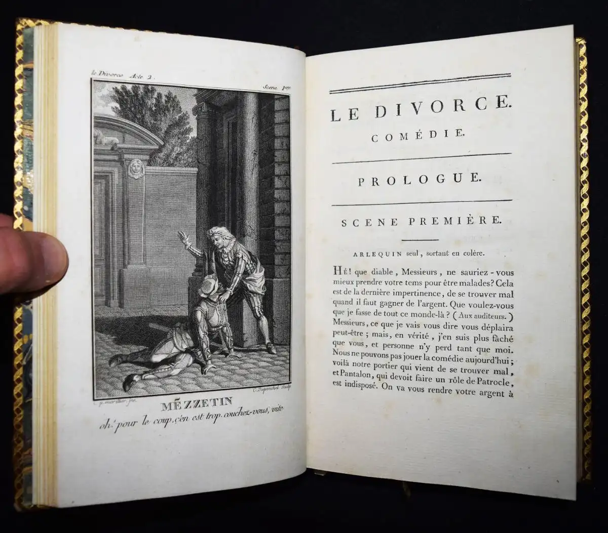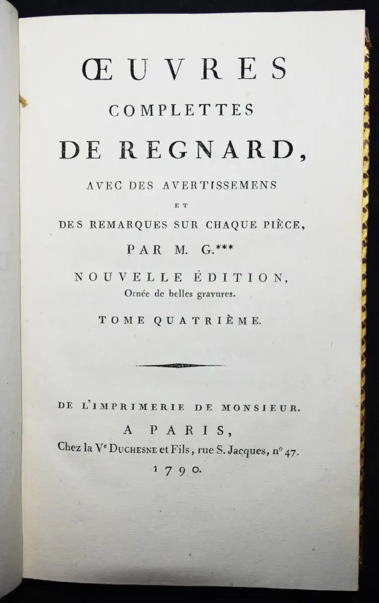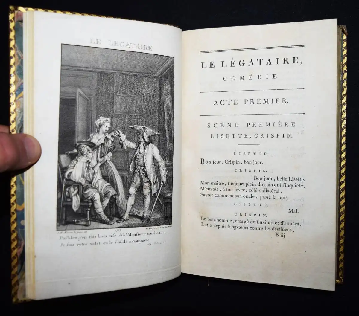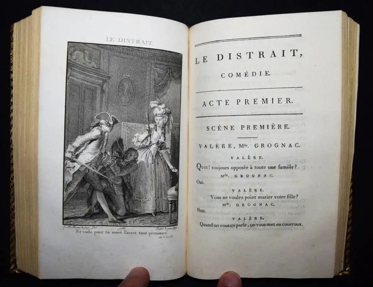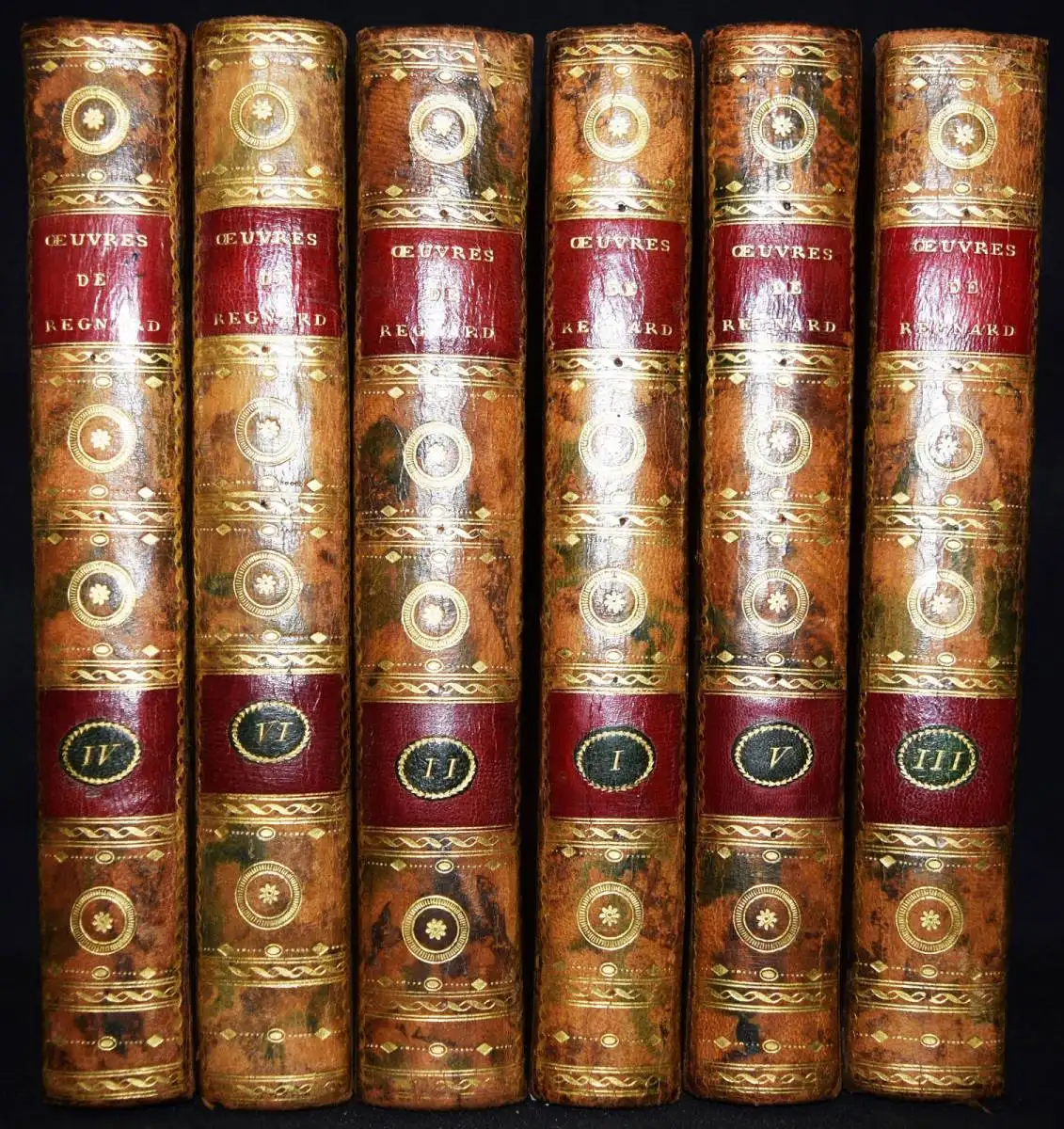 Regnard, (Jean François). Oeuvres complettes. Avec des avertissemens et des remarques sur chaque pièce par M. G. Nouvelle édition, ornée de belles gravures. 6 Bände. Paris, Duchesne et fils 1790. 8°. Mit gestoch. Portrait von Alexandré Tardieu nach H. Rigault und 11 Kupfertafeln von Delignon, Duponchel, Halbou, Langlois u. a. nach Marillier (4) u. Moreau le Jeune