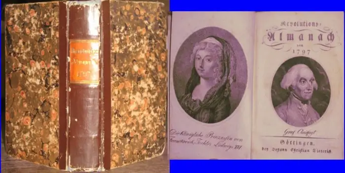 S. 30 eine Korrektur in alter Tinte ganz zierlich, S. 195 Anmerkung dito. // Paginierung springt von Seite 91 auf 94, Text jedoch komplett. // Seite 180 folgen zwei Kupferstichtafeln mit 5 Porträts: Washington und Tell - Die Helden der alten Freiheit sowie Horne Tooke, Ankarstrom und Chalier - Die Helden der neuen Freiheit. Seite 246 eine weitere Tafel mit drei gestochenen Porträts: Camus, Chenier und Lanjuinais. S. 334 ff. eine Bildfolge in 12 Tafeln "Die alten und neuen Franzosen" sowie "Die alten und neuen Deutschen". S. 364 Tafel mit 2 Porträts: Erzherzog Carl und Graf Wurmser. -- Im Inhalt: Lied für deutsche Vaterlandsfreunde. Weitere Bruchstücke aus dem Tagebuche eines Deutschen, der vom J. 1789 bis 1795 in Frankreich war. III. Dem Retter Deutschlands, zum Beschluß des 4ten Feldzugs wider die Franzosen, gesungen von Huschke, 1796. IV. Bruchstücke aus der geheimen Geschichte der Regierung des Landes zwischen Rhein und der Mosel, von einem neu-fränkischen Offizier. V. Deutscher Biedersinn und französische Dankbarkeit. VI. der französische Apostel in Deutschland, eine Warnung ans Volk. VII. Die Belgier. VIII. Straßburg unter der Revolutions-Regierung… -- Fünfter Jahrgang des von Reichard (1751 - 1828) herausgegebenen Almanachs.