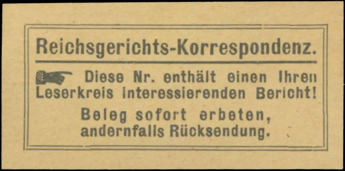 Diese Nr. enthält einen ihren Leserkreis interessierenden Bericht! Reichsgericht, Zeitung, Größe/Zustand: 2x5 , guter Zustand, Original alte Reklamemarke die seinerzeit für die Werbung benutzt wurde