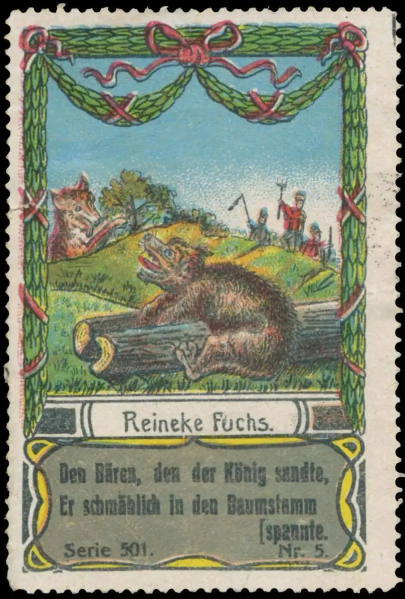 Den Bären, den der König sandte, er schmählich in den Baumstamm. Serie 501, Nr. 5, Größe/Zustand: 7x4 , beschädigt, Original alte Reklamemarke die seinerzeit für die Werbung benutzt wurde