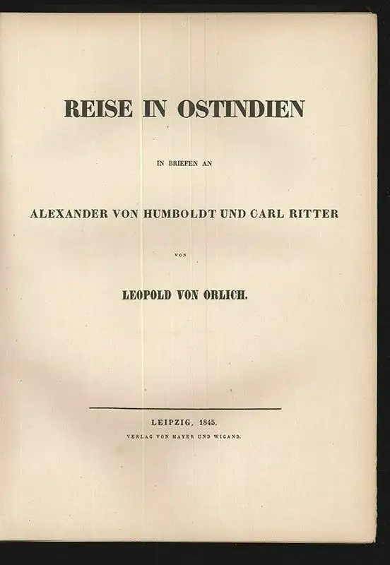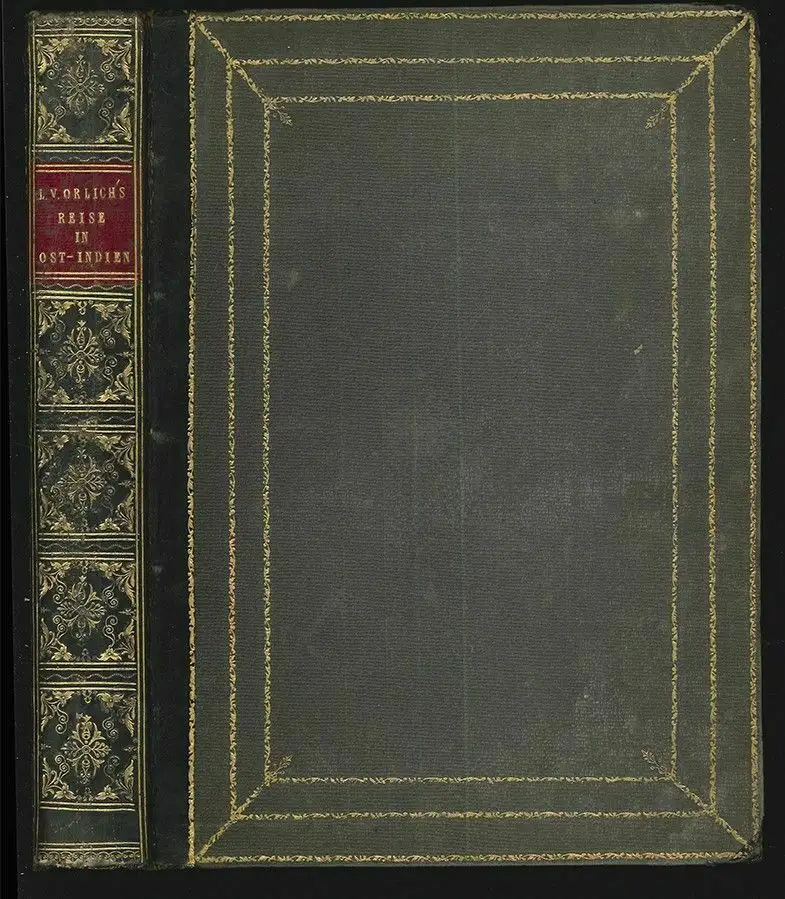 Bemerkungen: Lipperheide Ld 33; Embacher 221 - Erste Ausgabe. "Schon im Jahr 1845 erschienen seine [Orlichs] Reisebriefe als Buch, ein prächtiges, mit farb. Lithogr. ausgestattetes Werk, dass zu den ersten Büchern dieser Art in Deutschland zählt." (ADB XXIV, 424). Der preussische Offizier Orlich berichtet detailliert aus dem von ihm 1842-43 bereisten Gebiet. Die Illustrationen zeigen Ansichten v. Taj Mahal, Mothy, Jamima Moscheen, folklorist. Szenen, Volkstypen. First edition.