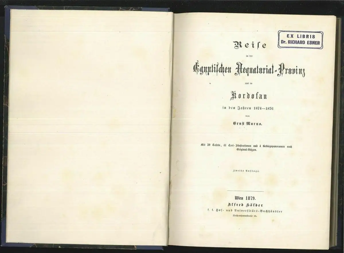 Bemerkungen: Ibrahim-Hilmy II, 18; Henze III, 377ff.; Kainbacher 294, 2; vgl. Embacher 202 (EA) - Zweite Auflage des erstmals im Jahr zuvor erschienen seltenen Werkes des österreichischen Afrikaforschers Ernst Marno (1844-1883). Marno unternahm mehrere Reisen, vor allem nach Nordafrika, "schließlich durchzog er, von April bis Mai 1875, fast gleichzeitig mit den Offizieren der von Major H. G. Prout geführten ägyptischen Expedition, Kordofan, dessen Karte er durch einige Routiers etwas ergänzen konnte." (Henze III, 378f.). Die vorliegende zweite Ausgabe erschien ohne den 160-seitigen Anhang und die beiden Karten der Erstausgabe.