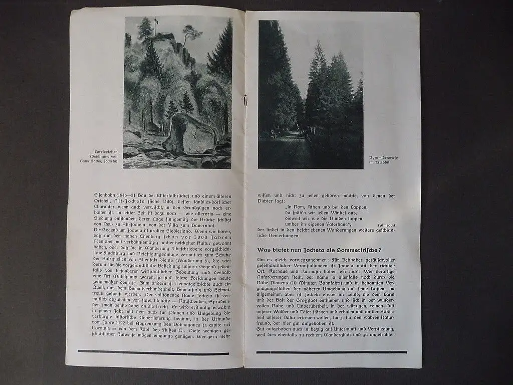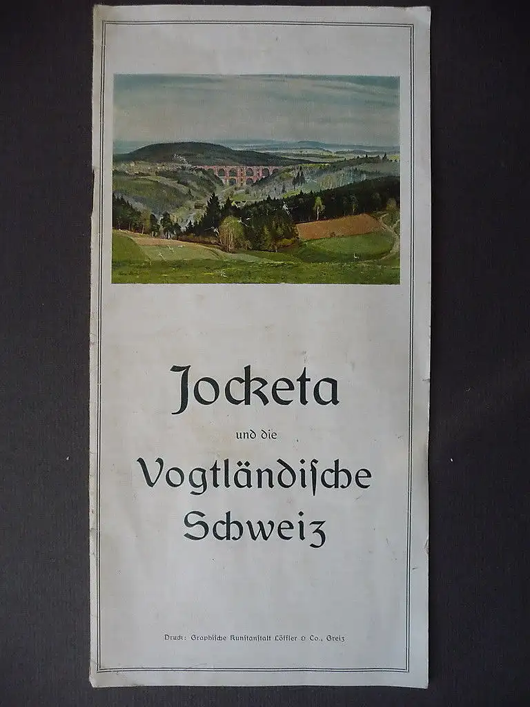 Alter touristischer Prospekt "Jocketa und die Vogtländische Schweiz" Hg. vom Verkehrs- und Verschönerungsverein Jocketa e.V. u. d. Gemeinde Jocketa, o.J. (ca. 1930/40) Enthält eine Ortsbeschreibung, empfehlenswerte Wanderungen, Tagesausflüge, eine Wegekarte, mehrere S/W-Abb. Umfang 16 S. (inkl. Umschlag), geheftet, Format ca. 12 x 23 cm Zustand: mit Alters- und Gebrauchsspuren, etwas angeknittert und fleckig. Zustand vgl. Fotos!