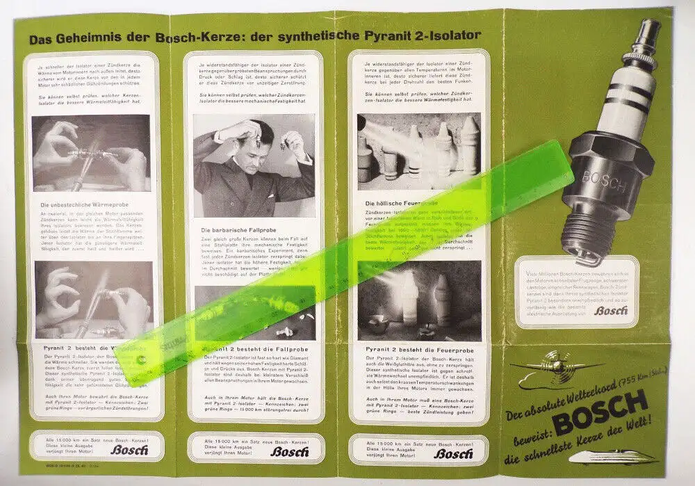 Jeweils 1 originales Prospekt, ca. um 1940. Bosch Zündkerzen. Format im aufgeschlagenen Zustand: 42 x 30 cm. Erhaltung: ein Prospekt mit Vertriebsstempel, leicht unsauber, ansonsten gut, alles weitere siehe bitte Fotos.