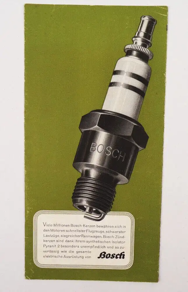Jeweils 1 originales Prospekt, ca. um 1940. Bosch Zündkerzen. Format im aufgeschlagenen Zustand: 42 x 30 cm. Erhaltung: ein Prospekt mit Vertriebsstempel, leicht unsauber, ansonsten gut, alles weitere siehe bitte Fotos.