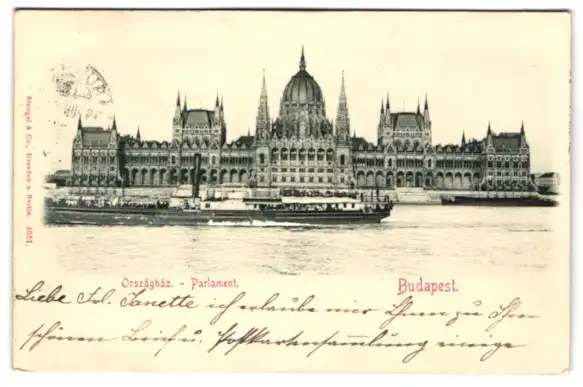 Relief-AK Budapest, Dampfer vor dem Parlament