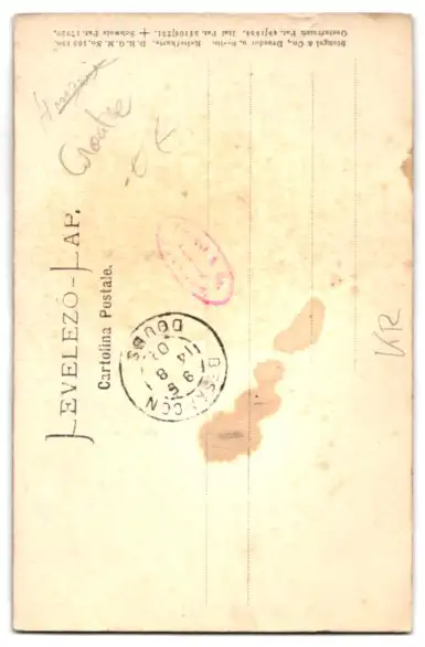Personenbezogene Daten auf der Rückseite der Karte wurden durch blauen Textmarker unkenntlich gemacht. Die blauen Stellen sind auf die Vorderseite durchgeweicht und wirken sich negativ auf das Postkartenfoto aus