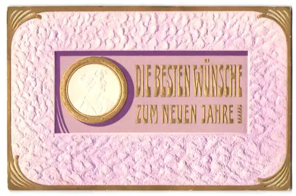 Relief-AK Frauenportrait in goldenem Rahmen, Neujahrsgruss