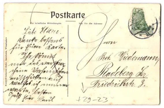 Personenbezogene Daten auf der Rückseite der Karte wurden durch blauen Textmarker unkenntlich gemacht. Die blauen Stellen sind auf die Vorderseite durchgeweicht und wirken sich negativ auf das Postkartenfoto aus