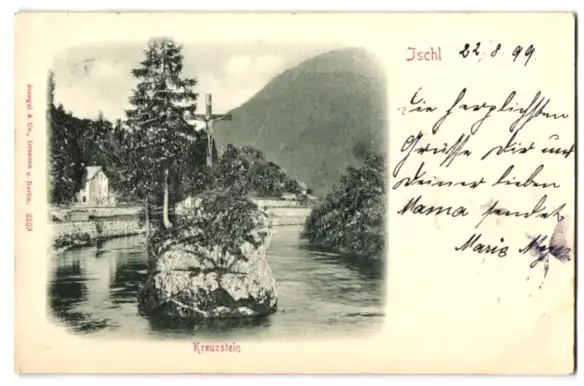 Relief-AK Ischl, Flusspartie mit Kreuzstein