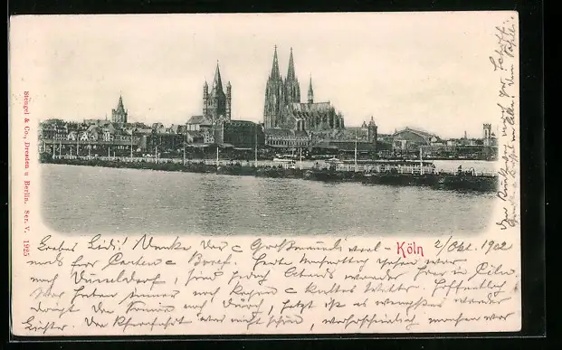 Relief-AK Köln, Ortspartie mit Fluss und Dom