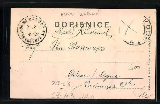 Personenbezogene Daten auf der Rückseite der Karte wurden durch blauen Textmarker unkenntlich gemacht. Die blauen Stellen sind auf die Vorderseite durchgeweicht und wirken sich negativ auf das Postkartenfoto aus