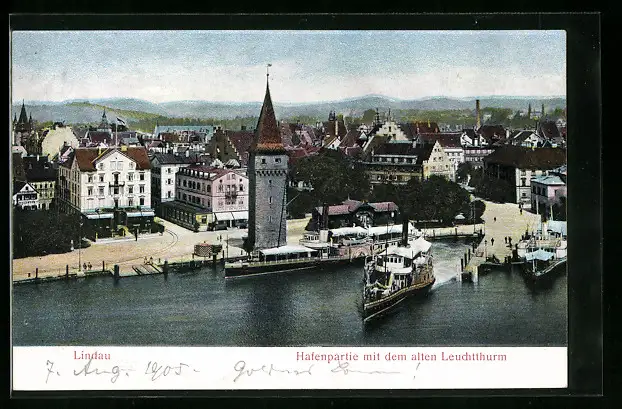 Relief-AK Lindau, Hafenpartie mit altem Leuchtthurm und Dampfer