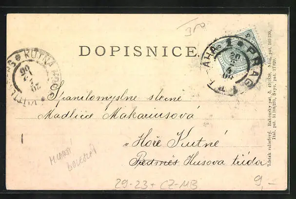 Personenbezogene Daten auf der Rückseite der Karte wurden durch blauen Textmarker unkenntlich gemacht. Die blauen Stellen sind auf die Vorderseite durchgeweicht und wirken sich negativ auf das Postkartenfoto aus