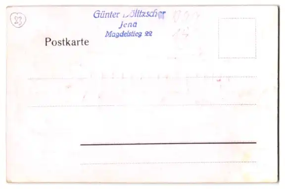 Personenbezogene Daten auf der Rückseite der Karte wurden durch blauen Textmarker unkenntlich gemacht. Die blauen Stellen sind auf die Vorderseite durchgeweicht und wirken sich negativ auf das Postkartenfoto aus