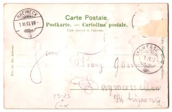 alte Ansichtskarte, gelaufen 1903, Briefmarke entfernt, rückseitig Oberflächenschaden, guter Zustand