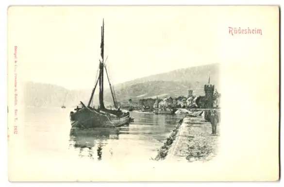 Relief-AK Rüdesheim / Rhein, Uferpartie mit Segelboot