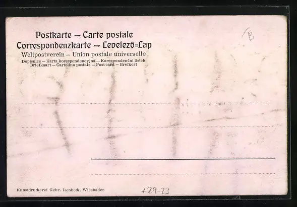 Personenbezogene Daten auf der Rückseite der Karte wurden durch blauen Textmarker unkenntlich gemacht. Die blauen Stellen sind auf die Vorderseite durchgeweicht und wirken sich negativ auf das Postkartenfoto aus