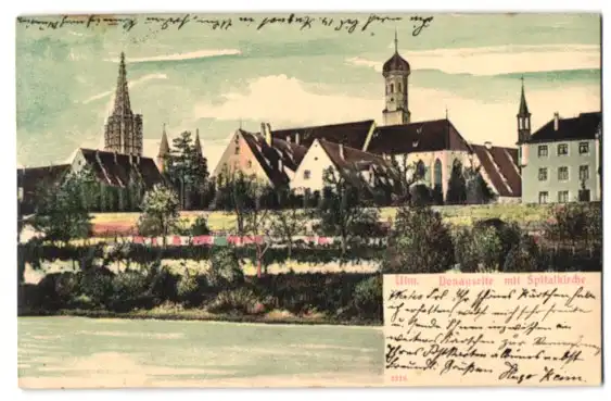 Relief-AK Ulm / Donau, Donauseite mit Spitalkirche