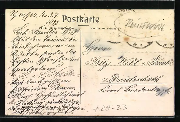 Personenbezogene Daten auf der Rückseite der Karte wurden durch blauen Textmarker unkenntlich gemacht. Die blauen Stellen sind auf die Vorderseite durchgeweicht und wirken sich negativ auf das Postkartenfoto aus